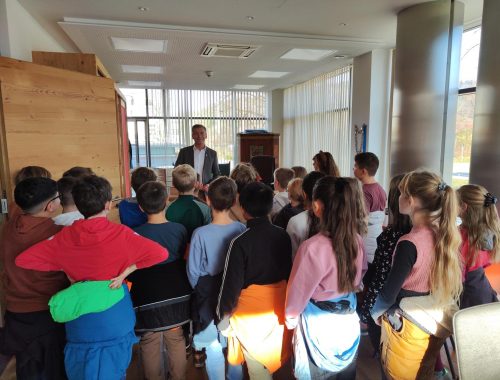 Passend zu unserem Jahresmotto „Demokratie“ und als Höhepunkt unseres HSU-Themas „Gemeinde“ unternahmen die 4. Klassen in der Woche nach den Herbstferien spannende Ausflüge zum Rathaus. Ziel war es, hautnah zu erleben, wie unsere Kommune funktioniert und wer die Fäden in der Hand hält. Wir wurden herzlich von Bürgermeister Jens Zangenfeind empfangen. Zuerst stand ein informativer Rundgang durch das Rathaus auf dem Programm, bei dem wir unter anderem einen Blick in das persönliche Büro des Bürgermeisters werfen durften. Der spannendste Teil des Vormittags fand jedoch im Sitzungssaal statt. Mehr…